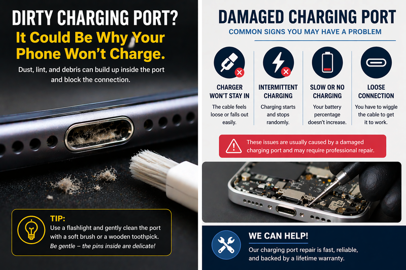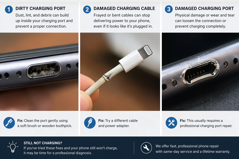 In many cases, the issue comes down to a worn charging port or failing battery — both of which can be fixed quickly.